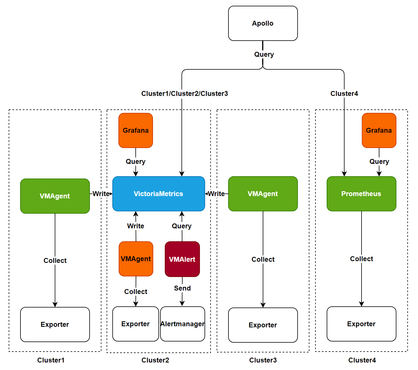 - Uses VMAgent to collect data and write to VictoriaMetrics.